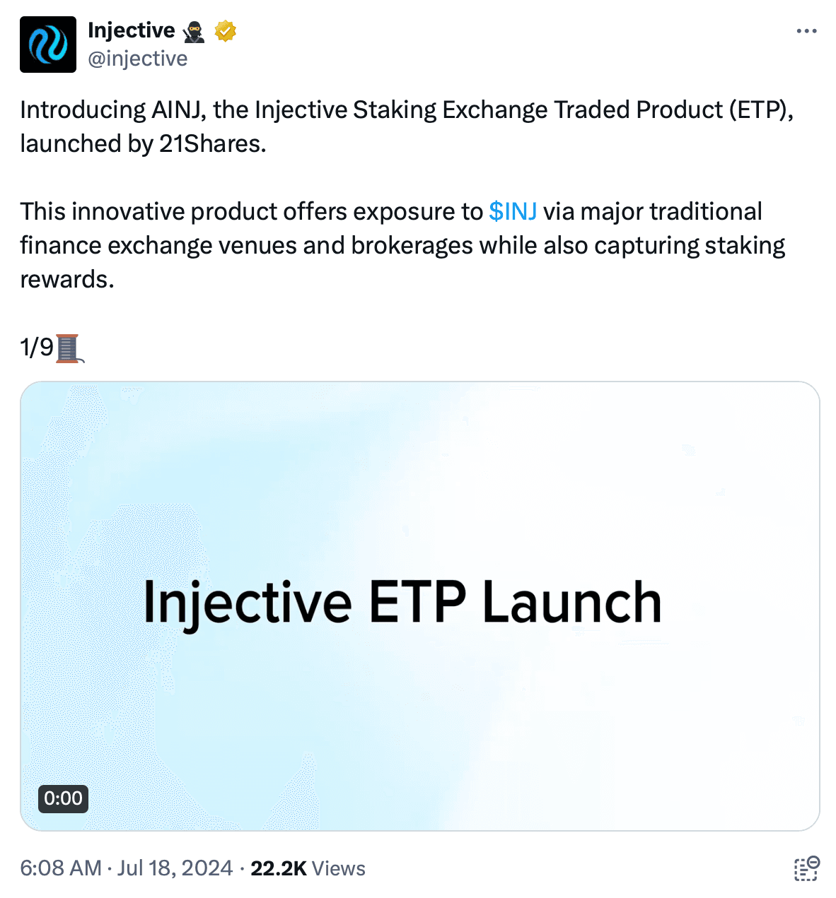 The Injective Staking Exchange Traded Product (AINJ) will track the performance of Injective (INJ) and capture staking yield for reinvestment in the ETP. Injective is a decentralized blockchain designed for financial applications.
