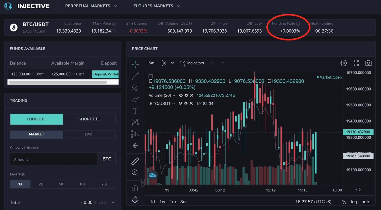 The funding rate is used in conjunction with the spot index price (sometimes called mark price) to keep the contract in line with the underlying asset's actual value. The spot index price is the calculated broad market value of the underlying asset.