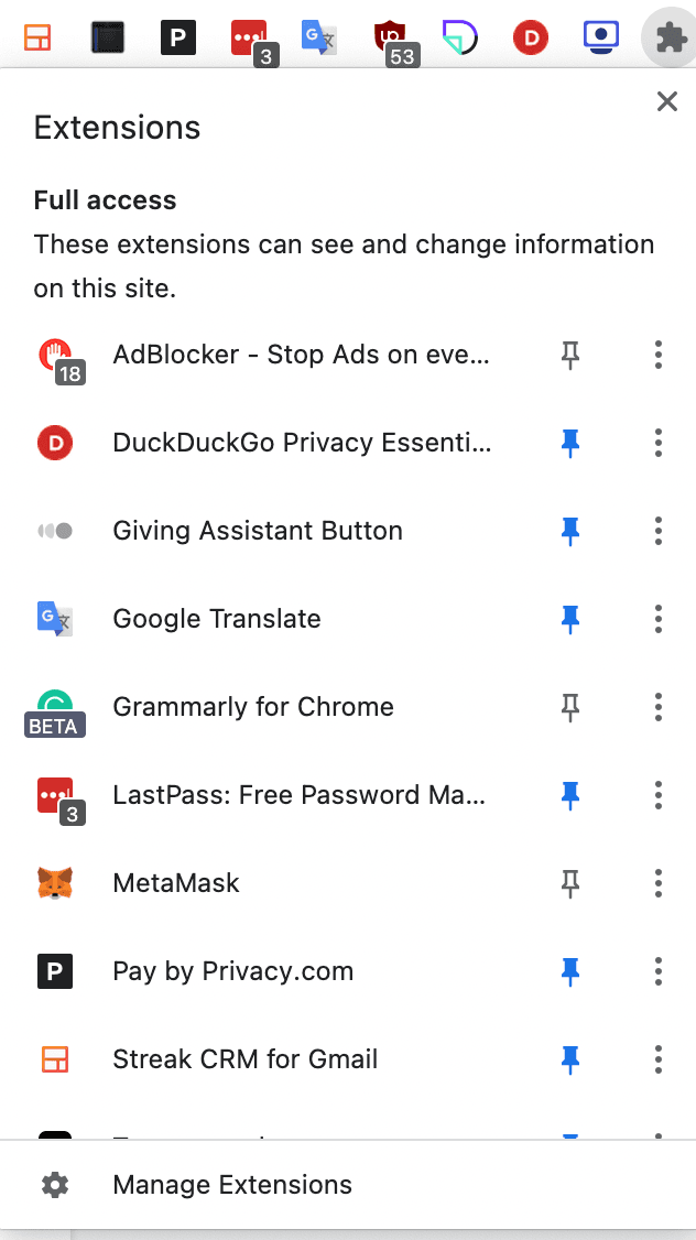 4. Click the puzzle icon on the top right-hand corner of your browser to display your list of extensions. Then click the pin button next to MetaMask to pin the MetaMask extension to your extension bar.