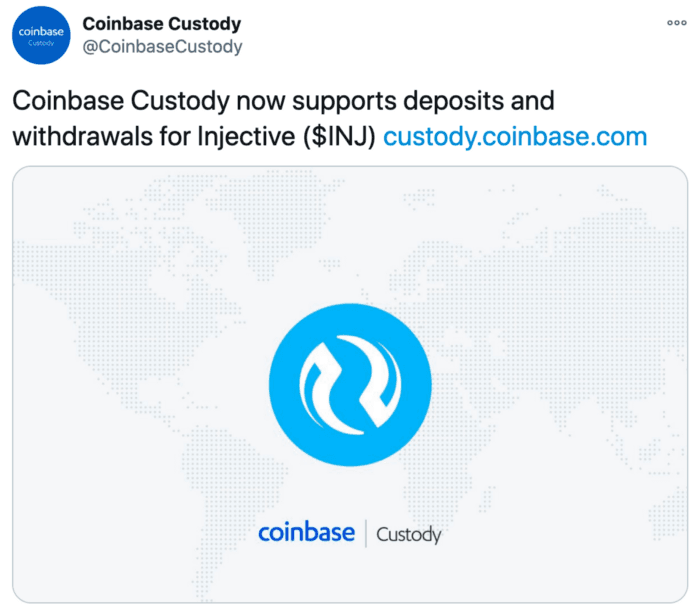 INJ was added to Coinbase Custody which will now support INJ deposits and withdrawals.