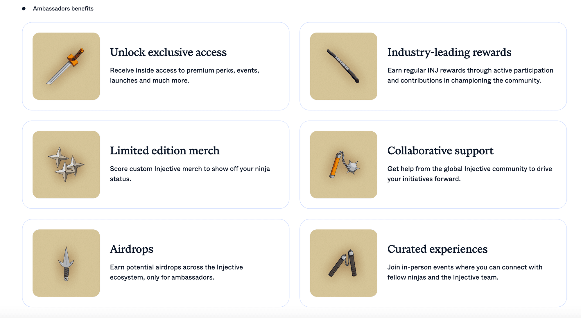- Once you’re part of an ambassador group, you can start earning regular INJ rewards every month and be eligible for other ambassador perks.