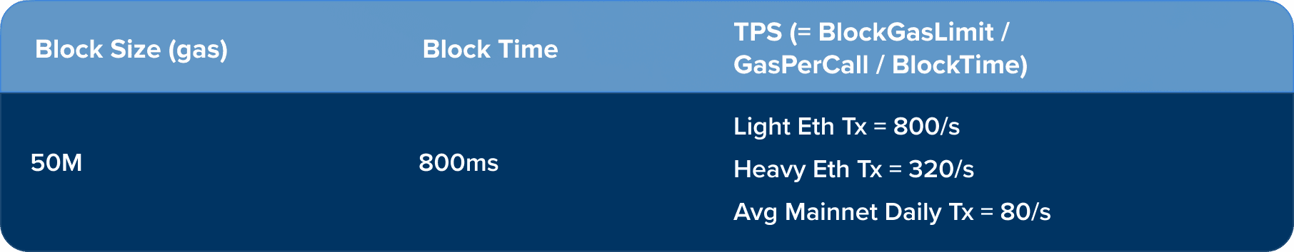 Heavy transactions, which involve 10,000 internal calls (costing 25M gas) each, demonstrated high performance, with the network capable of 20 heavy transaction executions per second. Meanwhile, lightweight operations, like ERC20 token transfers and mints, reached impressive speeds of 9,000 executions per second, showcasing the module’s efficiency in handling both heavy and light transactions with minimal delay. In fact, native EVM's maximum theoretical TPS displayed in this phase of testing surpasses that of Base, Optimism, and Starknet by at least 7,500 TPS each, making it over 6x faster.1