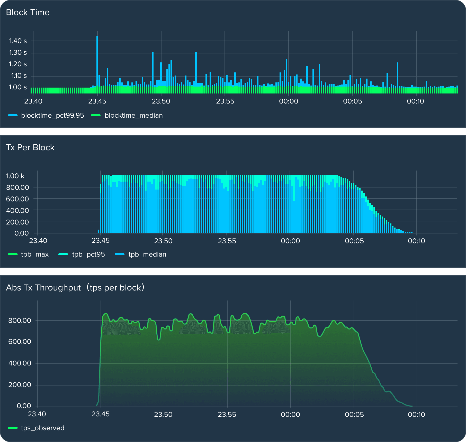 The second phase simulated Injective’s mainnet conditions in an end-to-end environment using a full, 3-node local consensus setup. Critical settings were chosen to mirror mainnet conditions, most importantly: