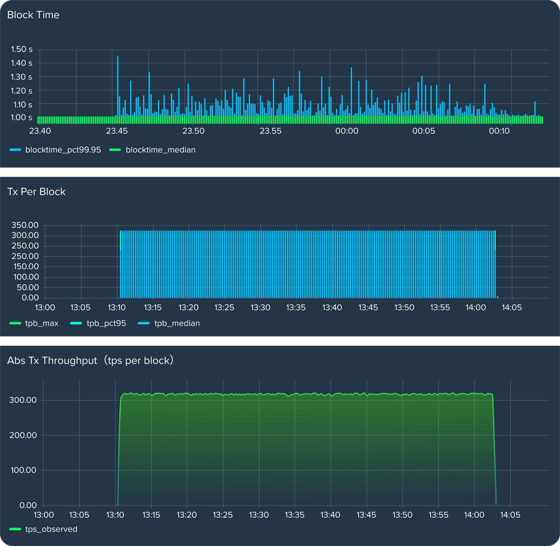 Note: Increasing the gas limit per block or expanding the mempool capacity could technically allow for a higher transaction volume; however, this significantly impacts the BFT consensus layer, introducing substantial overhead that offsets the advantages of added transaction throughput. For example, while it would be possible to fit 10,000 EVM transactions within a single block, the block propagation time would increase to around 10 seconds, leading to delays in finality. To maintain an optimal balance between performance and network stability, test parameters were chosen to align with mainnet settings, ensuring consistent chain stability while handling a substantial volume of EVM transactions.